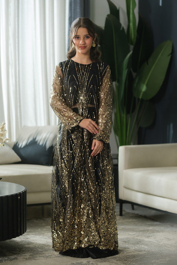 Material: Sequence Net with Silk & Chiffon A luxurious black frock paired with a sheer...