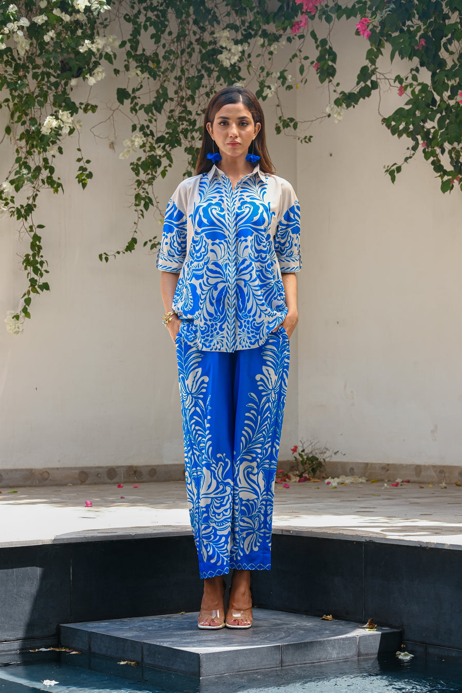 Introducing the “Bali” summer outfit, crafted from luxurious crepe material in a serene blue and white color scheme. This sophisticated two-piece set features a stylish short-sleeve shirt and matching trousers, designed to capture the essence of relaxed elegance. The lightweight crepe fabric drapes beautifully, providing both comfort and a flattering silhouette. Ideal for beachside strolls or summer gatherings, the “Bali” ensemble effortlessly combines chic simplicity with a touch of tropical charm. Embrace effortless style and cool sophistication with this versatile outfit, perfect for making a statement during the sunny season. Discover summer elegance with the “Bali” set.