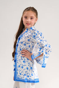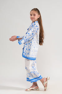 Embrace elegance with this charming blue and white two-piece set. The beautiful floral design on the top is complemented by matching pants, making it perfect for casual outings or family events. A perfect blend of style and comfort!