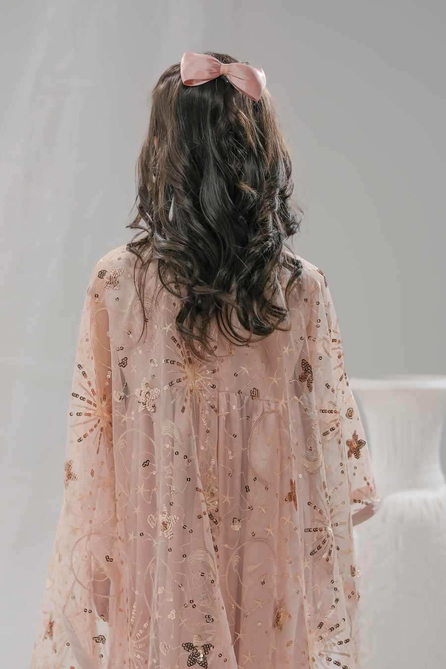 This stunning outfit features a delicate dull silk inner dress paired with a sequined net jacket, perfect for any festive occasion. The soft peach color adds charm, while intricate detailing shimmers in the light, ensuring your little one stands out beautifully.