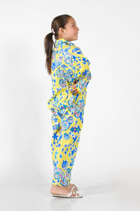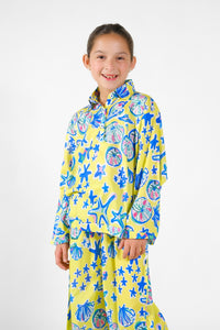 Introducing the delightful "Marina" ensemble, a burst of joy in radiant yellow adorned with enchanting blue and pink shells and starfish. This outfit encapsulates the warmth of the sun and the whimsy of the sea, combining vibrant hues to create a harmonious symphony of color. Each shell and starfish detail dances across the fabric, invoking the tranquility of coastal shores and the allure of underwater wonders. Whether frolicking in the sand or basking in the sun's glow, the "Marina" outfit radiates charm and elegance, promising to infuse every moment with the magic of summertime bliss.