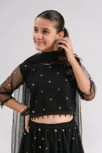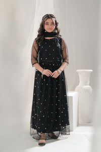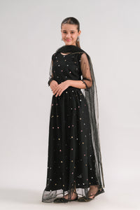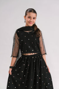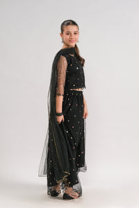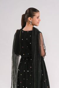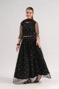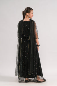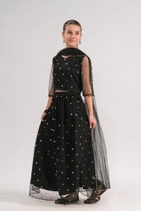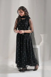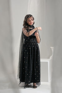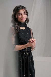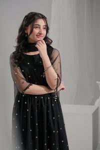 Elegance meets mystique in Midnight Bloom—a graceful black ensemble that embodies the beauty of the night sky sprinkled with twinkling stars. Adorned with delicate, colorful sequin embellishments, this outfit captures the essence of a midnight garden in full bloom. The sheer sleeves and dupatta add a touch of ethereal charm, making it perfect for festive occasions, formal gatherings, and celebratory events.