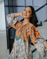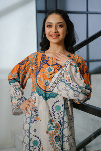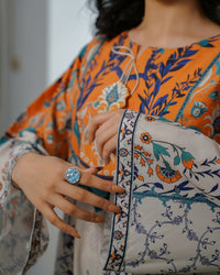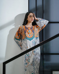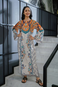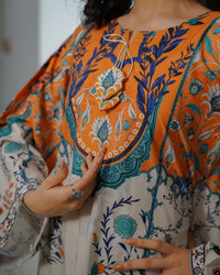 A vibrant fusion of orange and teal, this kaftan blooms with swirling floral vines — perfect for breezy days and festive nights.