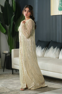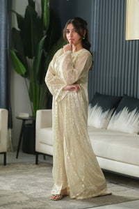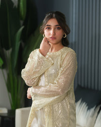 A cream-toned jumpsuit with a sleek, straight-cut coat embellished in textured shimmer. Refined and radiant, it’s tailored for polished, festive elegance.