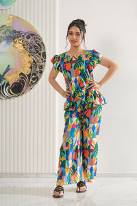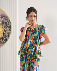 A vibrant patchwork of geometric shapes and leafy motifs in bold colors. Diagonal ruffle detailing and a flared hem make it perfect for playful adventures.