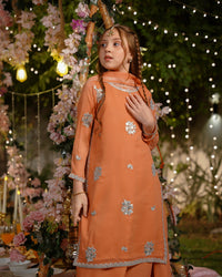 A charming pink sharara set with silver embellishments. The long shirt, flared pants, and dupatta shimmer with playful elegance — perfect for festive twirls and joyful moments.