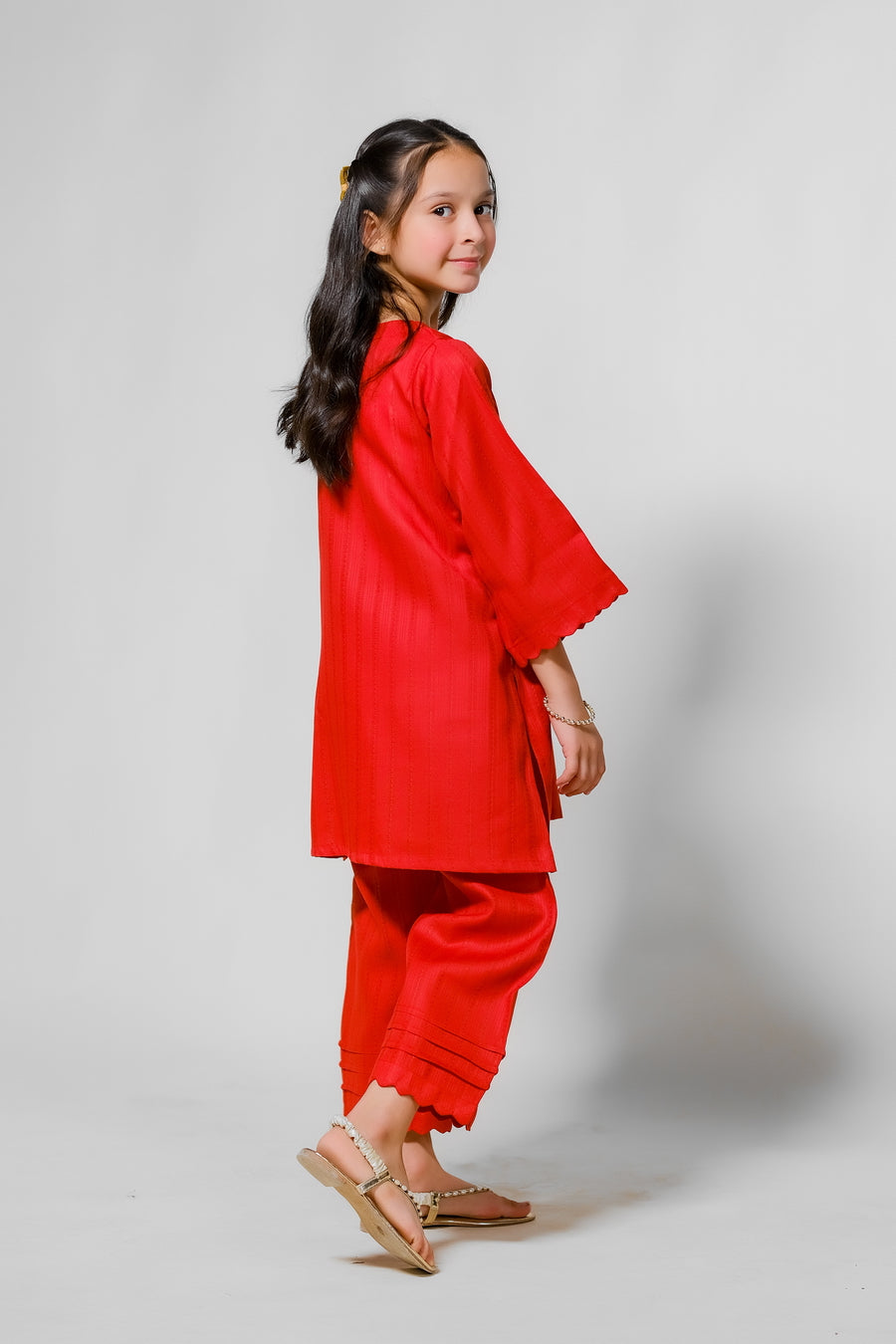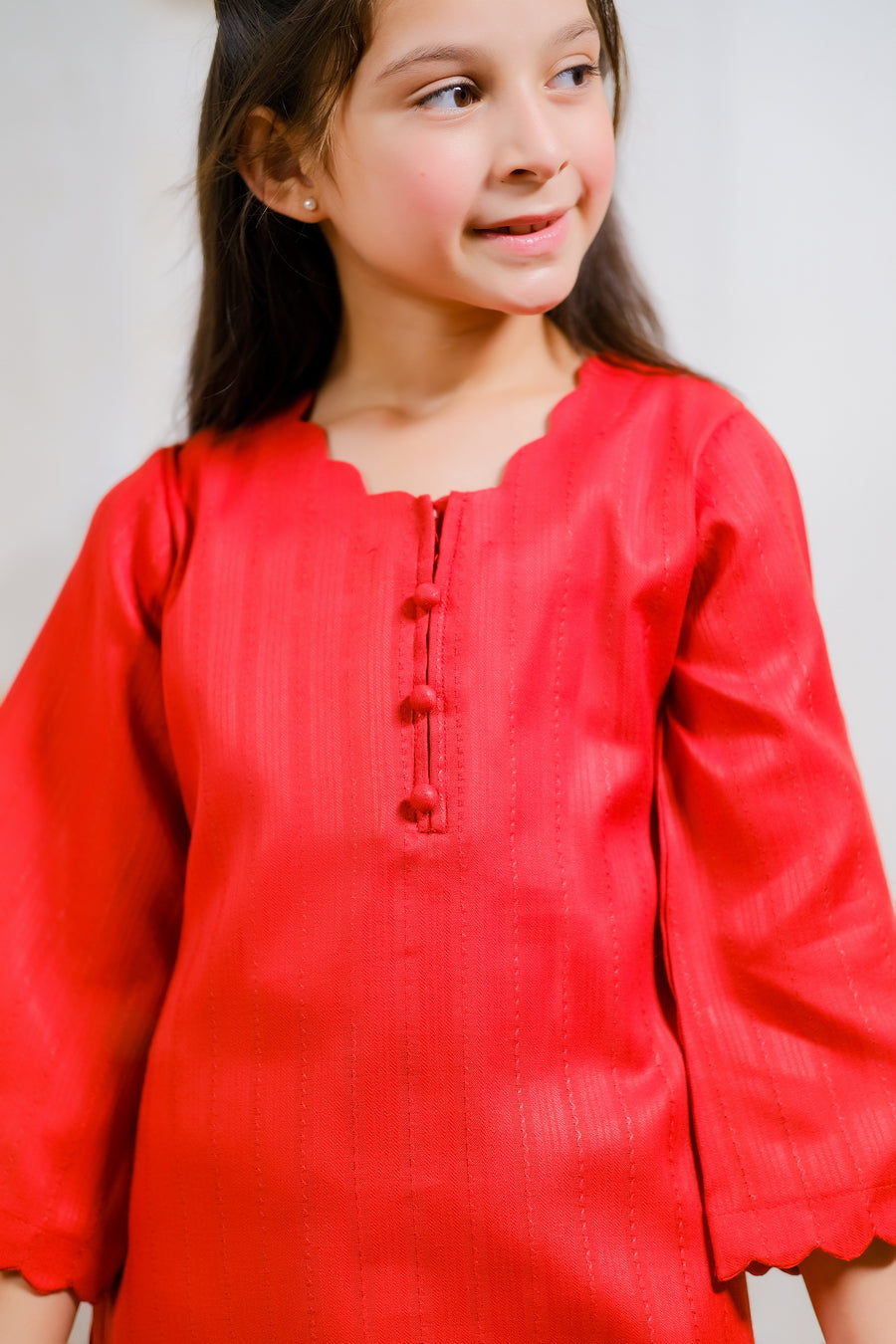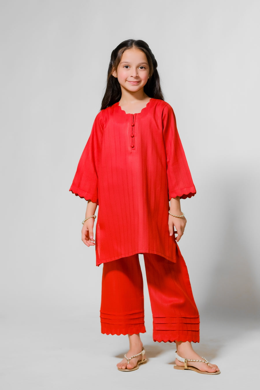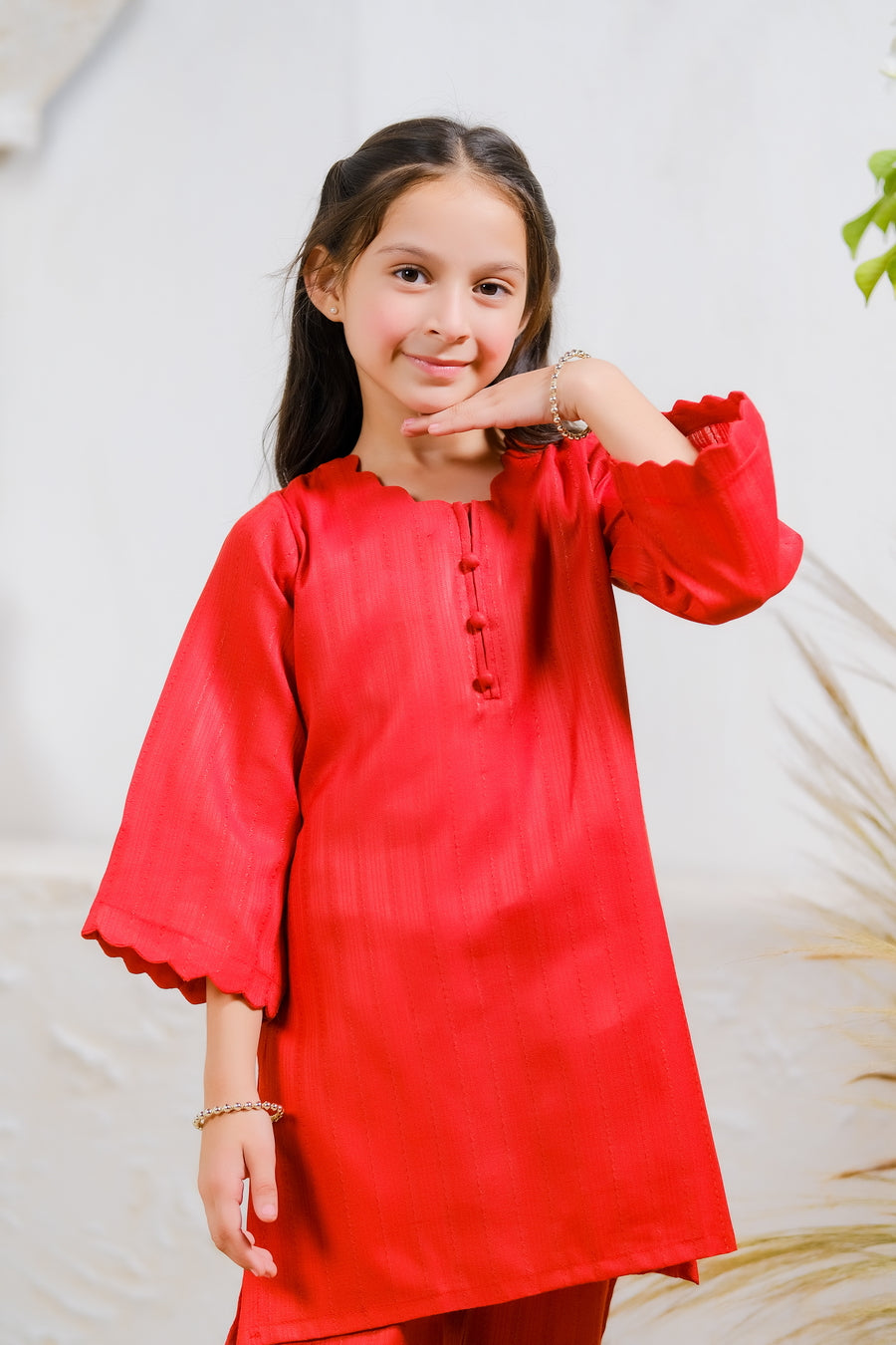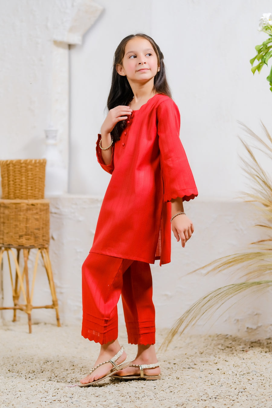 Elevate your little one's style with the Scarlet Serenity 2-Piece Cotton Ensemble. This charming outfit features a beautifully tailored kurta and matching wide-leg trousers in a vibrant scarlet red hue. Made from 100% breathable cotton, it ensures comfort and ease of movement, perfect for both casual outings and festive occasions. The kurta is designed with a scalloped neckline and three-quarter sleeves, adding a touch of elegance, while the trousers boast a pleated hem for a chic, contemporary look. Whether paired with sandals or traditional footwear, this ensemble will make your child shine with confidence and grace. Available in a variety of sizes, it's a must-have for any stylish wardrobe.