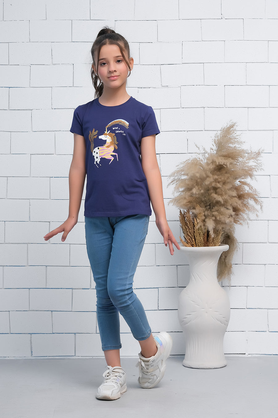 Navy Blue Short Sleeves Colourful Unicorn Print Tee