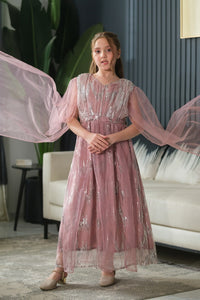 A soft pink dress with silver embellishments and a sheer overlay. Featuring a V-neckline and cinched waist, it radiates charm and sophistication for special celebrations.