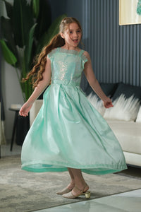 Sequence Net with Silk & Chiffon A mint green version with the same glittery bodice and satin flow — fresh, graceful, and celebration-ready.