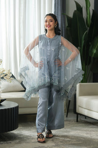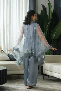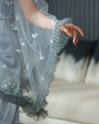 A light blue jumpsuit paired with a sheer, embroidered coat featuring scalloped edges and floral motifs. The layered flow adds softness and movement — perfect for graceful