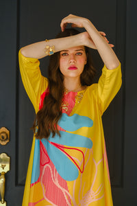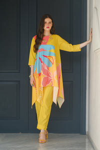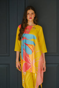 Introducing the “Sundown” summer outfit, designed to brighten your wardrobe with its vibrant yellow crepe fabric. This eye-catching two-piece set features a chic short-sleeve shirt and matching trousers, highlighted by a bold, oversized flower graphic on the front. The lightweight, breathable crepe material ensures ultimate comfort and a flattering fit, perfect for warm-weather outings. Whether you're enjoying a sunny day at the beach or attending a lively summer event, the “Sundown” ensemble combines playful elegance with effortless style. Make a statement this season with this radiant, floral-inspired outfit that celebrates the joy and warmth of summer.