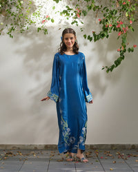 A deeper blue kaftan with green and white embroidery along the sleeves and hem. Bold yet graceful, with a touch of coastal charm.