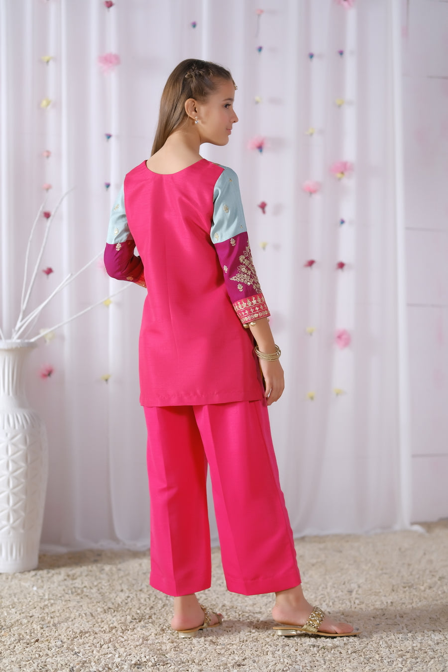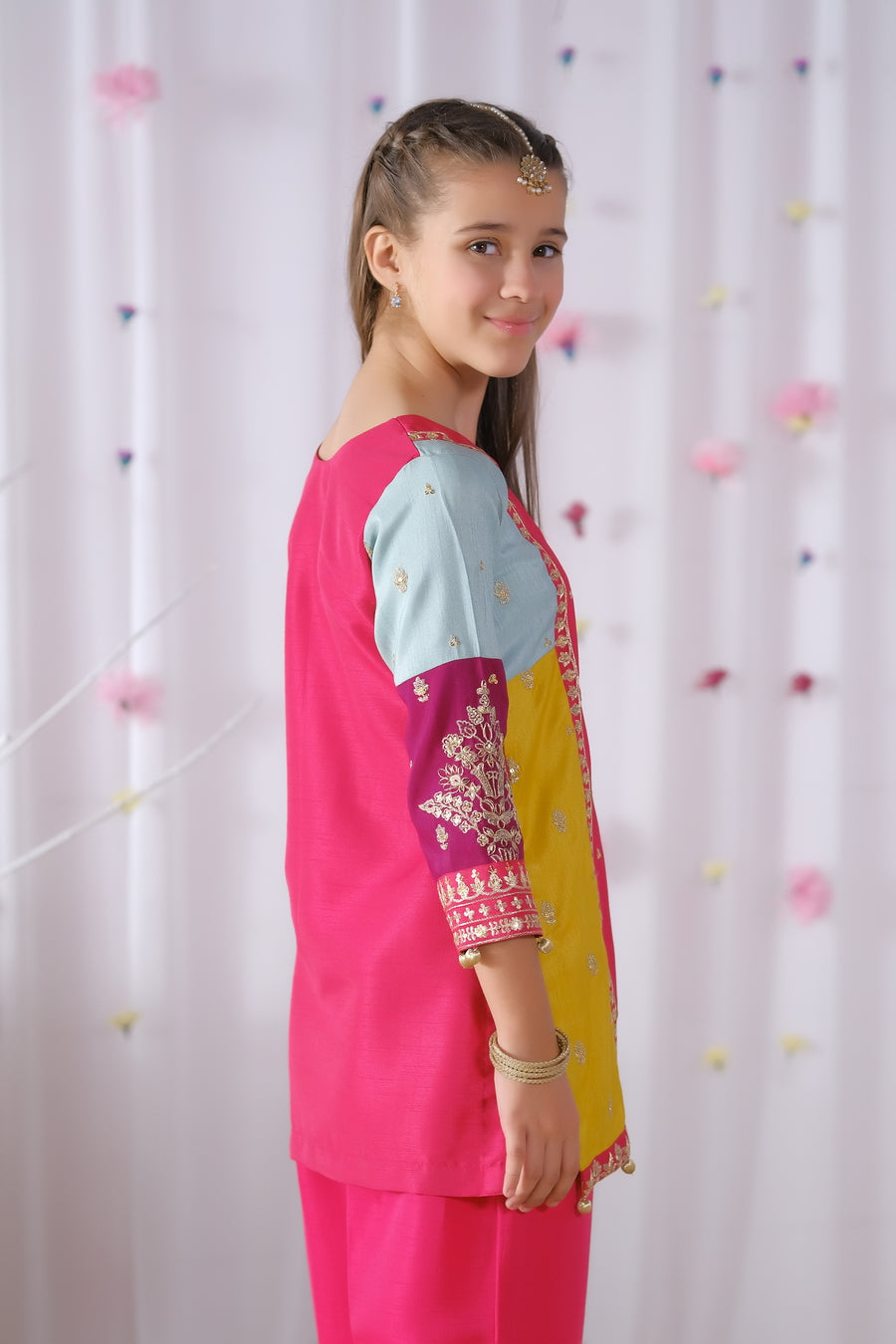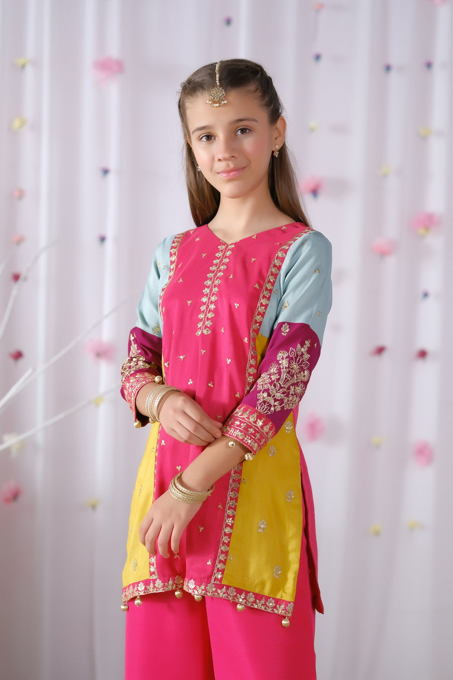 Introducing "Rangreza," a vibrant multicolor two-piece outfit for girls that celebrates the beauty of diversity. The thigh-length top features a playful patchwork of pink, blue, yellow, and purple fabric pieces, exuding joy and charm. Perfect for lively occasions, this ensemble captures the essence of fun and creativity, allowing your little one to shine bright with every step.