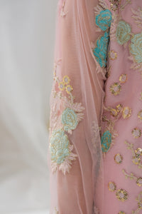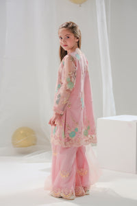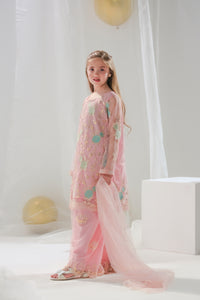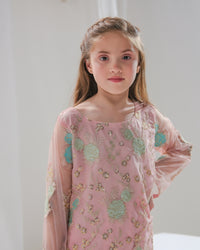 The Aiza ensemble exudes elegance and grace with its soft blush pink tones and intricate embroidery. This 3-piece set includes a delicately embroidered tunic adorned with pastel floral motifs and beadwork, paired with flared trousers featuring embroidered details. The sheer dupatta completes the look, making it perfect for festive occasions and celebrations. A blend of tradition and modern charm, designed for little fashionistas.