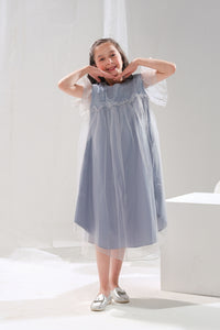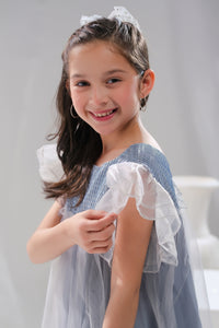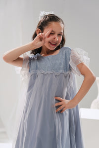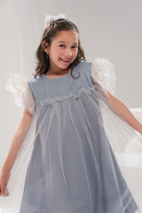 Grace meets charm in the Crystal Belle dress, a delicate masterpiece designed for little ones who love to twirl and shine. This enchanting light grey dress features a shimmering bodice with a soft, airy tulle overlay that creates an ethereal, fairy-like effect. The fluttery ruffled sleeves add a playful touch, making it perfect for birthdays, weddings, or any magical celebration. With its flowing silhouette and elegant shine, Crystal Belle brings fairy-tale dreams to life.