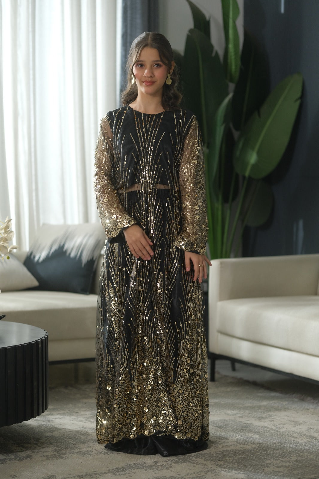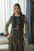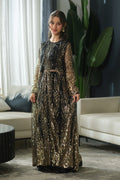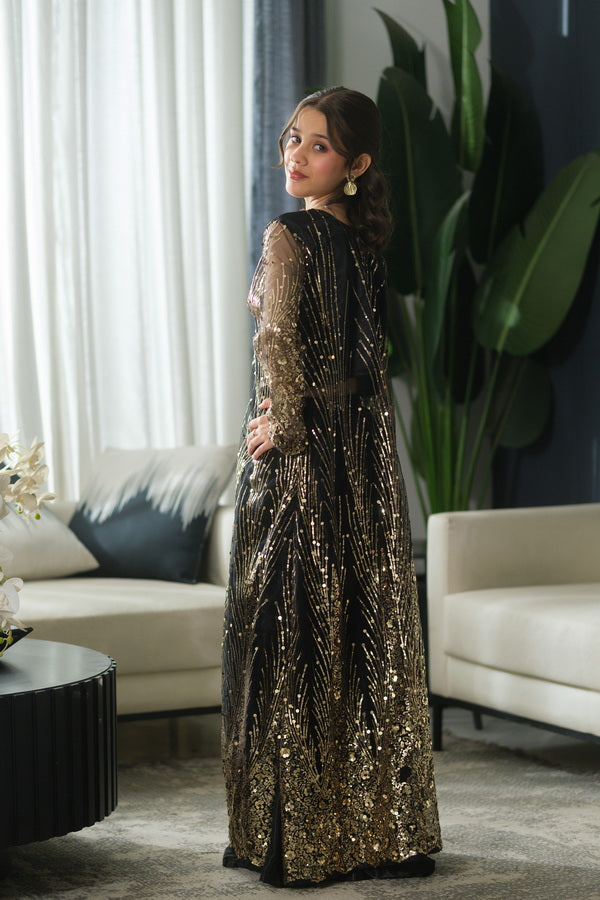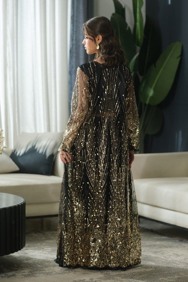 A luxurious black frock paired with a sheer coat adorned in intricate gold embroidery. Vertical and radial motifs shimmer across the hem and sleeves, creating a dramatic silhouette fit for festive evenings and formal occasions. The rich contrast of black and gold evokes timeless elegance with a modern edge.