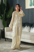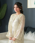 A cream-toned jumpsuit with a sleek, straight-cut coat embellished in textured shimmer. Refined and radiant, it’s tailored for polished, festive elegance.
