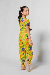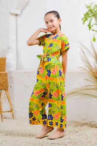 Embark on a colorful adventure with the Sunshine Safari Jumpsuit. The bright yellow base is brought to life with vivid tropical prints, making it a lively and playful choice for summer outings. With its easy fit and fun design, it's perfect for energetic days filled with exploration.