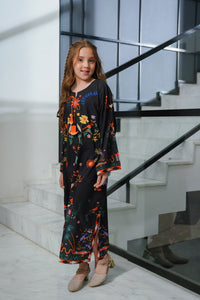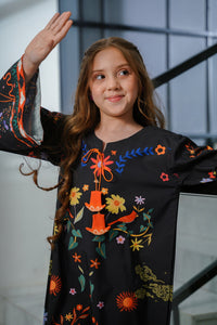 Bold and dramatic, this black kaftan bursts with colorful florals and rich red detailing for a striking evening look.