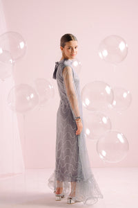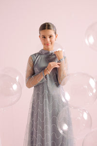 This enchanting festive dress brings a touch of magic to any celebration. Made from delicate, shimmering fabric, this dress features a beautiful wavy pattern that glistens with subtle iridescence. The long sleeves and high neckline add an elegant touch, while the flowing skirt with a ruffled hem creates a dreamy silhouette. Perfect for weddings, parties, or any special occasion, this dress will make your little one feel like a star.