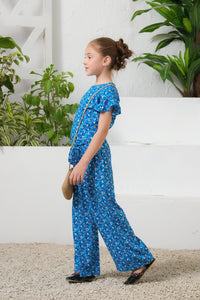 Sky Petal Allover Floral Print Ruffle Trim Belted Jumpsuit