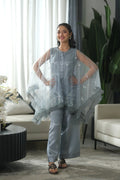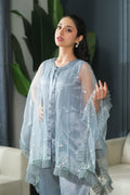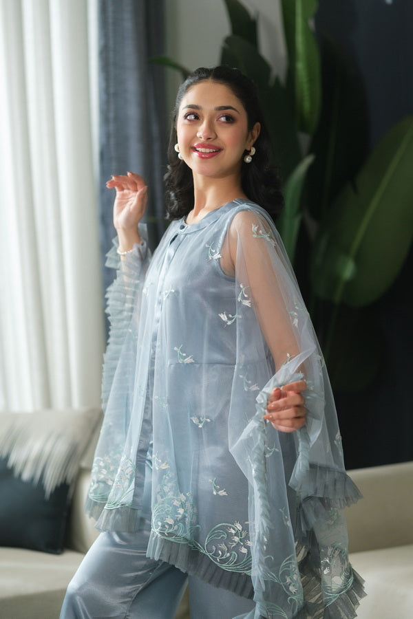 A light blue jumpsuit paired with a sheer, embroidered coat featuring scalloped edges and floral motifs. The layered flow adds softness and movement β perfect for graceful