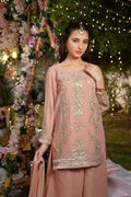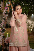 A soft pink straight-cut shirt drenched in elaborate gold embroidery. Styled with flared trousers, a matching dupatta, and a delicate pouch, it radiates grace and celebration.